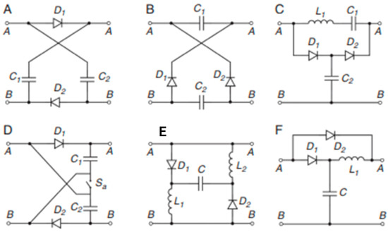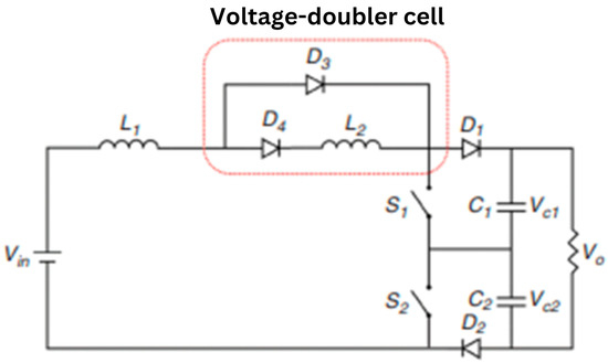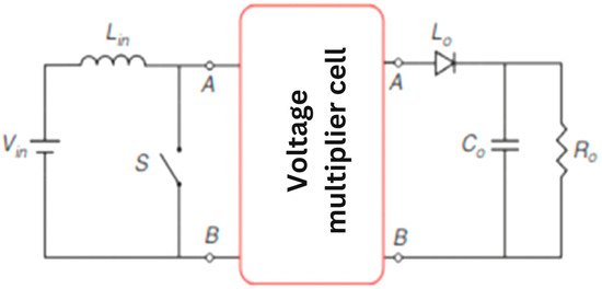 There exist several VMC topologies that are determined on the basis of amalgamation of many passive elements comprising of capacitors and inductors, which consist of various semiconductor devices like MOSFET, IGBT, diode, etc. This arrangement resulting in a multiplier circuit with individual features. Figure 8 shows the fundamental circuitry of DC–DC boost converter with VMC [104]. A few topology variants are depicted in Figure 9 [106]. This amalgamation results a multiplier circuit associated with distinctive characteristics. These topologies are appropriately fitted due to their ability of stepping up low input voltage to a desired level on the grid end.