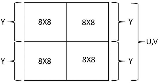 A common practice is a quartered resolution of the U data and the V data, which is called 4:1:1 chroma subsampling [12]. This 4:1:1 denotes there are four times more luminance data than the chrominance data. In other words, for each block of 16 × 16 that can be divided to four blocks of 8 × 8, as shown in Figure 1, there are four Y blocks and just one U block and one V block. Each row in an H.264 frame consists of lines of Y, U, and V blocks. The lines are positioned from top to bottom, where the blocks of each line are from left to right.