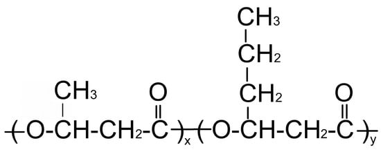 We used a copolymer of 3-hydroxybutyric–co-4-hydroxybutyric acid [P(3HB-co-4HB)] synthesized by the natural strain Cupriavidusnecator B-10646 according to our own developed technology at the Institute of Biophysics of the Siberian Branch of the Russian Academy of Sciences [] with a ratio of 3HB and 4HB monomers 74 and 26 mol.%, respectively, weight average molecular weight 640 kDa, number average molecular weight, 256 kDa, polydispersity 2.5, degree of crystallinity 49%, melting temperature 159 °C, thermal degradation temperature 250 °C. The structural formula of [P(3HB-co-4HB)] is shown in Figure 1.