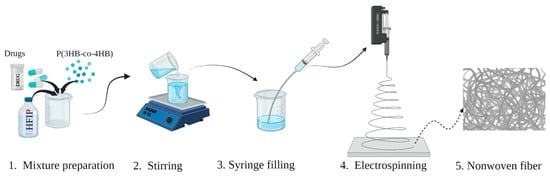 Schematic representation of the process of obtaining non-woven membranes containing drugs by the ESF method.