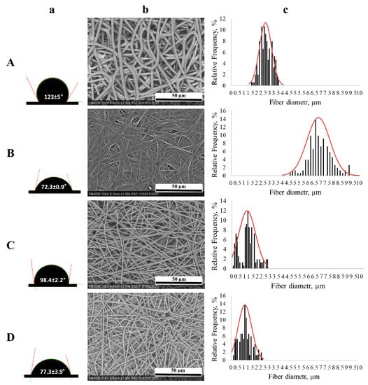 Characteristics of non-woven membranes containing drugs: A—P(3HB-co-4HB), B—P(3HB-co-4HB)/doripinem, C—P(3HB-co-4HB)/ceftazidime, D—P(3HB-co-4HB)/actovegin. Contact angles of wetting with water (a), SEM images (b), size distribution of fibers in membranes (c). Bar is 50 µm.