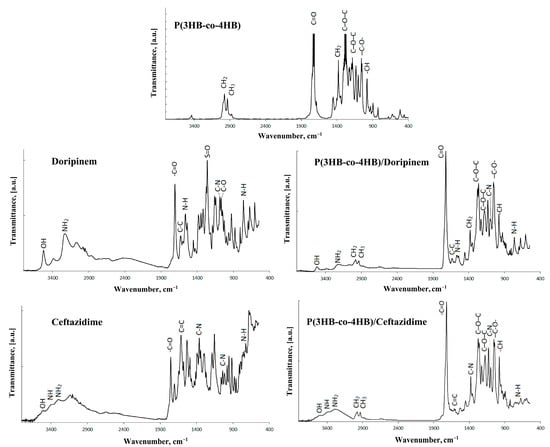 An analysis of the IR spectra of the obtained non-woven membranes P(3HB-co-4HB)/antibiotic (Figure 4) showed that no new significant absorption bands were found in the spectra of the samples, and there are bands characteristic of the original copolymer, and also antibiotics. This indicates the absence of chemical interaction between the components and the formation of new chemical bonds between them. Thus, constructed non-woven membranes prepared from solutions of a copolymer and antibiotics by the ESF method are physical mixtures.