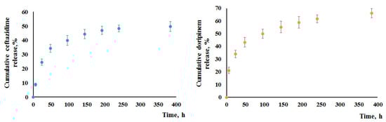 Actovegin consists of more than two hundred biological substances []; therefore, it is not possible to determine which of the drug components are active substances and to study their pharmacodynamics. In this regard, the dynamics of the release of drugs from the obtained non-woven membranes were studied only in relation to antibiotics (doripinem and ceftazidime). The results of the release of antibiotics from non-woven membranes, which were exposed to PBS solution (pH 7.4, 37 °C) for 16 days, are shown in Figure 5. The kinetic curves of the release of doripinem and ceftazidime had a two-phase character. At the first stage (6–48 h), the concentration of antibiotics in the medium increased, and starting from the 8th day (192 h), the outflow rate decreased.