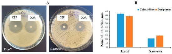 Antimicrobial activity of drug-loaded P(3HB-co-4HB) electrospun nanofibers tested against E. coli and S. aureus: images of Petri dishes (A) and diameter of zone of inhibition in mm (B). CEF—Ceftazidime, DOR—Doripinem.