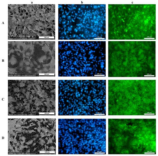 NIH 3T3 fibroblasts cultured on drug-containing P(3HB-co-4HB) non-woven membranes compared to controls (drug-free polymer membranes): A—P(3HB-co-4HB), B—P(3HB-co-4HB)/doripinem, C—P(3HB-co-4HB)/ceftazidime, D—P(3HB-co-4HB)/actovegin. SEM images (a), DAPI (b) and FITC (c) staining. Bar 100 µm.