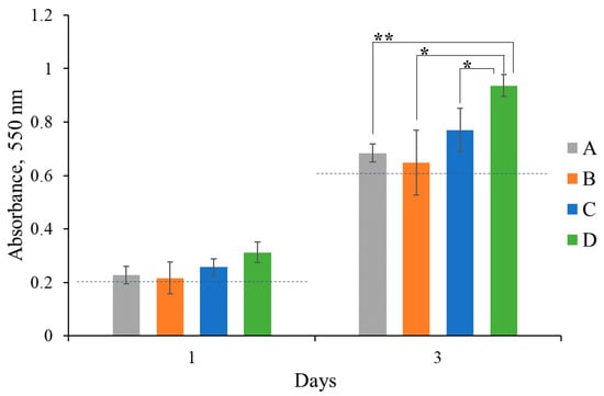 The number of viable cells was assessed in the MTT assay based on the reduction of 3-(4,5-dimethylthiazol-2-yl)-2,5-diphenyltetrazolium bromide (Sigma) by cell dehydrogenases to purple MTT-formazan crystals. In the wells with cultured cells, the medium was changed to a freshly prepared medium containing 5% MTT solution. After 4 h of incubation, the disks were transferred to clean plates, DMSO was added to dissolve the formed formazan crystals. After 30 min, the stained solutions were transferred to a 96-well plate and the optical density was measured at a wavelength of 550 nm using a Bio-Rad 680 microplate reader (Bio-Rad Laboratories Inc., Hercules, CA, USA).