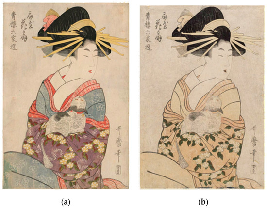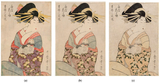 - Two Copies of a Japanese Woodblock Print by Utamaro. Available online: https://intheirtruecolors.files.wordpress.com/2014/09/fadeexample_woodblock.png (accessed on 30 April 2023).