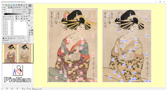As reported previously, the authors’ group has been developing user-friendly software (PicMan, WaferMasters, Inc. Dublin, CA, USA) for image-based dimension (length, area, circumference, circularity, etc.) measurement/analysis, quantitative color analysis, statistical analysis, and various image-tailoring functions to address the deficiencies in the above-mentioned areas with existing software [19,20,21]. Pattern selection, area selection, highlighting, editing, coloring, and transparency application to any digital image can be easily done. A few applications of these functions have been successfully applied to archaeology, cultural heritage, conservation science, material science, biology, medical science, semiconductor research, and development studies [21,22,23,24,25]. PicMan can handle various formats of digital image and video files such as JPG, BMP, GIF, PNG, TGA, TIFF, WEBP, JPEG XR, PDF, CR2, DM3, ND2, MIRAX, MOV, MP4, AVI, WMV, etc. for image analysis and processing. Detailed application examples of PicMan can be found in previous reports from other study groups [19,20,21,22,23,24,25]. Several new functions, such as pixel-by-pixel color difference mapping, block comparison, color interpolation, and extrapolation, for color fading characterization, have been added to this study.