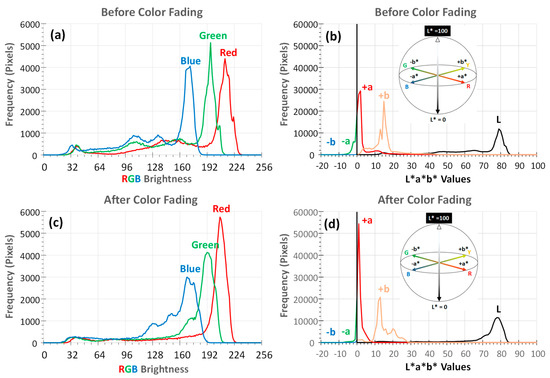 The RGB and CIE L*a*b* histograms of two rectangle areas with white border lines on the images before and after color fading and color darkening (in Figure 2) were plotted in Figure 3a–d. The image before color fading showed wide RGB intensity distribution due to the vibrant colors of the print image, as shown in Figure 3a. The CIE L*a*b* histogram showed a high CIE L* value peak at around 78, corresponding to bright colors on the image. As seen in Figure 3b, the majority of colors show a slightly reddish color (i.e., low positive value for CIE a*) and mild yellowish color (i.e., low positive values for CIE b*). The presence of small portions of pixels with a greenish color component can be recognized from the small area under negative CIE a* values in the range of −5 to 0.