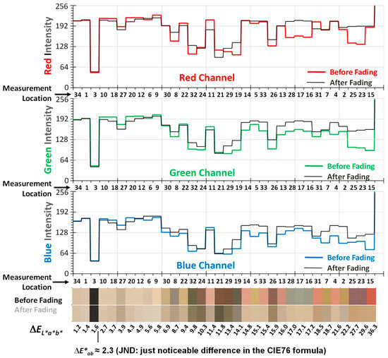 Figure 4 shows the RGB value change before and after fading and their colors at 34 five-pixel diameter ROIs in the ascending order of CIE rank, from left to right. Thick colored lines and thin black lines are the intensity (or brightness) of each color channel before and after color fading. Color fading generally makes the intensity (or brightness) increase in all RGB color channels except for a few measurement locations indicated with arrows. It clearly indicates that most colors become lighter after color fading. However, a few colors became darker under light illumination, as seen in the locations with negative CIE ΔL* values in Table 3. The red and green channel intensity changed noticeably compared to the blue channel intensity after color fading by light illumination. In general, darker colors with lower red and green intensities tend to fade more and result in noticeable color changes. As the results changed in the CIE, Δ was higher for the darker colors.