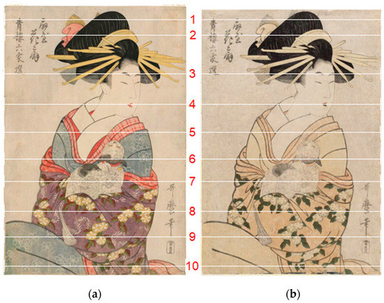Two copies of a Japanese woodblock print by Utamaro used in a Microfading Work-shop given in 2014 were selected as test images [1,18]. Figure 1 shows the two copies of the Japanese woodblock print by Utamaro (a) before and (b) after light exposure to cause significant color fading. According to the source, they were identical twins when they were printed. They were made from the same materials and printed in the same way. They were probably printed by the same people. Then the two copies were separated after printing, with one image experiencing significant color fading by light exposure. The light exposure has caused profound changes to a majority of colors used in the print. Some colors, such as the blue on the kimono (Japanese dress), are not very light-sensitive compared to the other colors. The purpose of the microfading experiment at the Getty workshop was to gain information on the light sensitivity of each colorant without the identical twins as a reference. Assuming the images were used as an example in a Microfading Workshop for professionals in the field, the images were digitized using the same equipment under the same conditions, including lighting conditions and environment.