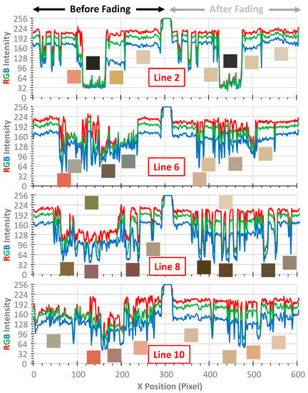 Line-by-line color information was extracted from 10 lines, as shown in Figure 5. Color information can be extracted from all lines in any direction, including free lines. Figure 6 shows the RGB intensity profile along 4 selected lines 2, 6, 8, and 10. Colors of a few locations per line showing noticeable color differences before and after color fading were shown together with RGB intensity line graphs.