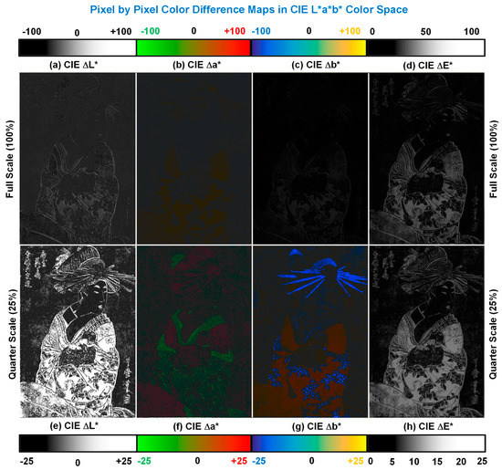 Pixel-by-pixel color difference in images in full scale (top row) and quarter scale (4× zoomed scale or 25% of full scale) (bottom row); (a) ΔL*; (b) Δa*; (c) Db*; (d) DE* in full scale; (e) DL*; (f) Δa*; (g) Δb*; (h) ΔE* in quarter scale (4× zoomed scale or 25% of full scale). Legends are given for easy recognition of pixel-by-pixel brightness, color shift, and color difference.