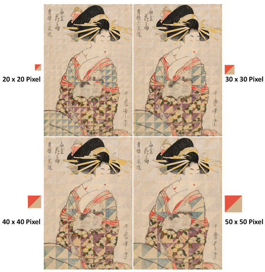 The two copies of a print, before and after color fading, were compared block-by-block using image processing/analysis software (PicMan). The block size was varied from 20 × 20 pixels to 50 × 50 pixels in 10-pixel increments (Figure 8). Upper-left and lower-right triangles show partial images before and after color fading for an easy comparison of the effect of color fading within areas of the same color patterns. The block-by-block image comparison technique, by alternating partial masking of the two comparing images with changing block size, provides intuitive synthesized images for side-by-side comparison on the reference image.