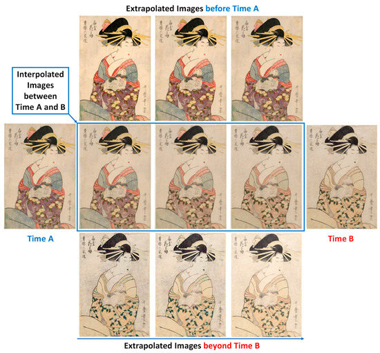 Figure 9 shows image blending simulation results using two true images by interpolation. Figure 9a,b is the original image at time A, and the color faded image at time B. Figure 9c is the interpolated result image for color fading in progress in the middle of times A and B. The image was generated by 50:50 blending or interpolation of the two images. By changing the blending ratio, many simulated images can be generated at different times between times A and B, as shown in Figure 10. Furthermore, extrapolation can be done before time A and beyond time B assuming the rate of color change are constant.