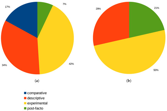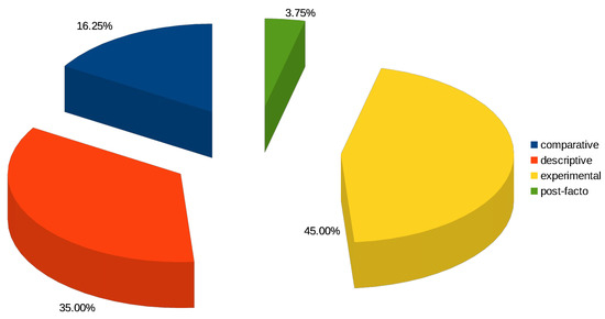 With the aim of facilitating normalization, the dataset was enriched by adding the methodology classification proposed by Khaldi [22], which includes in the experimental design: true experimental when variables can be manipulated, quasi-experimental when variables are manipulated in a controlled environment, and single subject in very punctual cases, which has not been included in this research. In the case of non-experimental design, on which variables cannot be manipulated, it was divided into: descriptive when there is data recollection, comparative when relationships are looked up, correlational when there are possible but not forced relationships, survey when it refers to surveys, and post facto when it focuses on effects and tries to establish causes.
