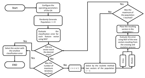 Figure 1 shows the methodology for the selection of characteristics. GA was used to select features to minimize the classification error of the validation data for a specific set of features used as input to a multilayer perceptron. The model hyperparameters were selected manually. The same input data from 9 of the 10 participants that comprised the database were used for the feature and hyperparameter selection.