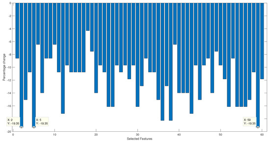 In order to ensure that the feature selection process was carried out correctly and that only predictors that allowed high classification were selected, a sensitivity analysis was carried out. In Figure 4, the bar graph is shown, where the percentage decrease or increase in precision can be observed concerning the classification obtained at the end of the character selection stage, which was 93%.
