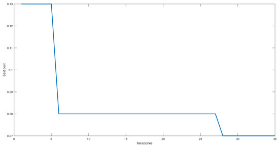 Figure 6 shows the error reduction in selecting hyperparameters by PSO. The best initial proposal achieves a 13% error. After this, there is a stage where the error percentage is kept constant until iteration 6. From there, the error is reduced to 8%. Once this error is reached, it remains constant until iteration 27. Once iteration 28 begins, an error of 7% is achieved, representing only a 1% improvement. This 1% improvement is not a significant increase and could be attributed to slight variations in the MLP training weights.
