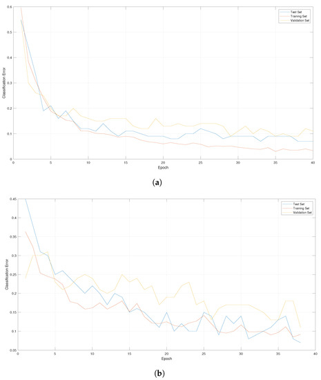 Additionally, these graphs allow us to verify the overfitting in the model. The training, test, and validation errors were plotted in each epoch. If the training error decreases while the test and validation errors increase, this suggests the presence of overfitting. However, the results indicated that the errors decreased evenly across the three stages, suggesting that the model can generalize and classify accurately without overfitting. In addition, the percentage for the hyperparameter values given by GWO only decreased by approximately 4% for new input data, reaching 93% accuracy. Meanwhile, for PSO, 3% was lost in the classification, achieving a final average close to 90%.