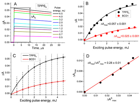 - In the first step, the amplitudes of the T1 state decay kinetic curves of the BCD and of the standard compound (ΔA0 and ) were measured for various exciting pulse energies (E) (Figure 2A).