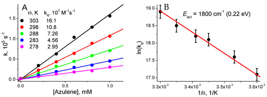 - In the second step, the dependence of ln(kq) on the reverse absolute temperature (1/Θ) was constructed to determine the activation energy (Eact), which is necessary to realize the energy transfer from the BCD T1 state to azulene (Figure 3B).