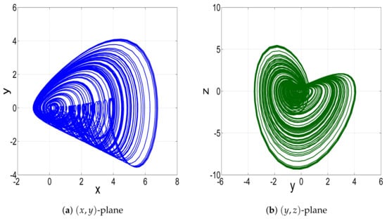 When , the jerk system has one positive LE value, as seen in Figure 7b, indicating that the jerk system (4) produces a chaotic attractor. When , the corresponding plot of a chaotic attractor in the -plane is shown in Figure 1b. Also, it is noted that there is a tiny window of periodic behavior sandwiched in the interval .