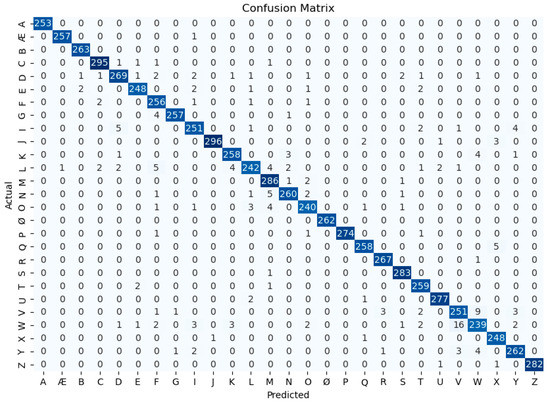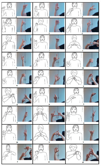 The signs must be performed and statically read to develop a static fingerspelling sign language model. The Norwegian Sign Language (NSL) includes 29 signs from A to Å. However, the letters Å and H cannot be statically displayed, so they were excluded from our research. Static images can display the other 27 signs, most of them as one-handed, but J, P, Q, U, X, Z, and Ø had to be represented as two-handed as there is no static one-handed version. All information about the NSL alphabet and the drawn images in Figure 2 was gathered from the Norwegian Sign Language Dictionary, www.tegnordbok.no accessed on 11 July 2023, which was developed by Statped (State Special Needs Education Service) on behalf of the Norwegian Directorate for Education and Training [27].