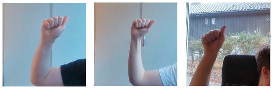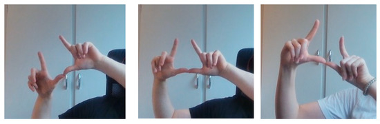 While different backgrounds and people are important steps in creating a dataset for a well-generalized model, we also ensured that the signs we performed during our image acquisition consisted of different angles and rotations of the different signs. In the same way that people pronounce words differently with their voice, signers have different hand orientations when they perform sign language gestures. By incorporating rotated images in the dataset, we can help the model learn to recognize the gestures regardless of the orientation of the signer’s hands. Examples of signs with different angles are shown in Figure 4, and different rotations are illustrated in Figure 5.