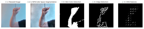 Once the images have been segmented, feature extraction provides the KNN model with the most relevant features. We applied the Canny edge detection technique to the grayscale version of the segmented images to achieve this. Subsequently, the skin color mask is applied to the edge image, further refining the features by focusing on the regions of interest. The HOG features are then computed for the masked edge image, generating a feature vector that effectively captures the essential shape and characteristics of the images. L2 normalization is employed to ensure that the HOG features have the same scale and can be effectively compared across images. Illustrated are Steps 4 and 5 in Figure 6.