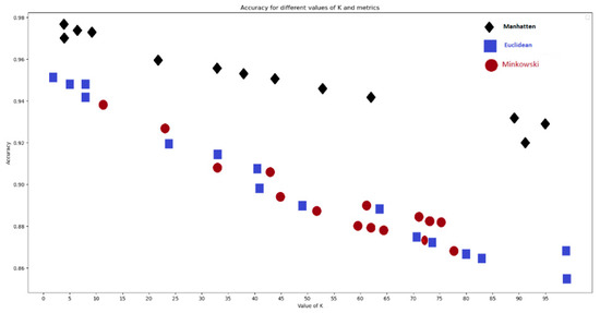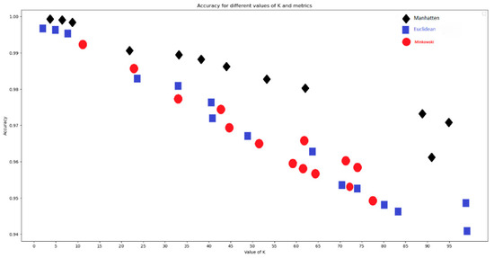 Figure 7 displays the accuracy for the different values of K and the different metrics. Upon completion of the randomized search and cross-validation process, the optimal hyperparameters for the KNN model with a 64 × 64 resolution were identified as follows: ‘metric’: ‘Manhattan’, ‘n_neighbors’: 4, and ‘weights’: ‘uniform’. By training the KNN model with these parameters, we achieved an outstanding accuracy of 99.9% on the unseen test dataset. This accuracy illustrates the effectiveness of the methods we have implemented in this model.