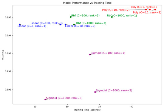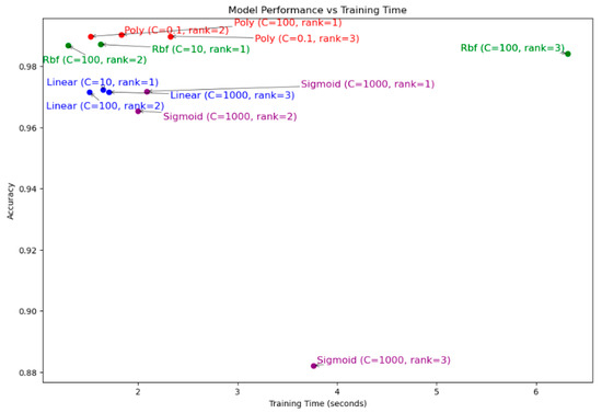 To visualize and compare the performance of these models, we created a bar plot displaying the accuracy of each model compared with their training time. This allowed us to identify the best-performing and most effective models across different kernel types.