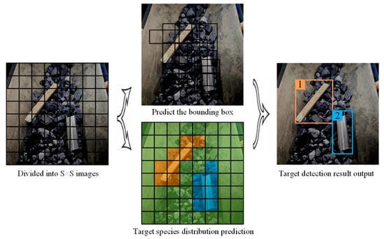 As shown in Figure 1, the input foreign object image is divided into S × S squares, and features are extracted from each grid through the convolutional neural network, then, features are fused and analyzed to output the confidence degree of the foreign object target, the boundary box coordinate information, and the foreign object category. In order to improve the accuracy of foreign object detection, a fixed number of anchor boxes are used for each grid to assist in learning position information. Clustering analysis is performed on the known labels of the target detection object in the image to obtain the initial size of the anchor box.