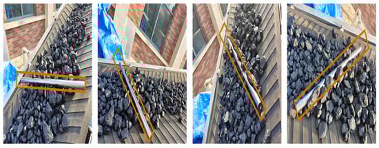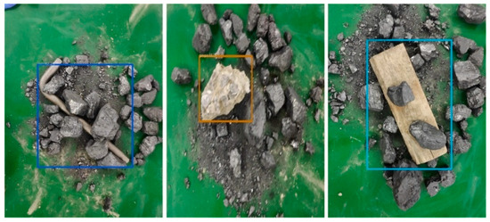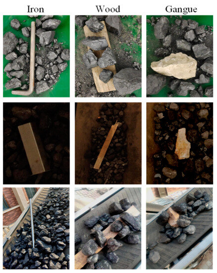 This work selected laboratory and belt-conveyor work scenarios for foreign object image collection. At the same time, foreign object image datasets were captured under different natural light conditions, and directional foreign objects such as iron and wood were offset to increase the information of image angles. In the laboratory environment, for the same foreign object, a foreign object dataset can be established that includes images of areas without coal flow, areas with coal flow, and areas obstructed by coal flow. Photos of foreign objects in different directions were collected in the laboratory environment to increase the diversity of foreign object dataset samples, as shown in Figure 5.