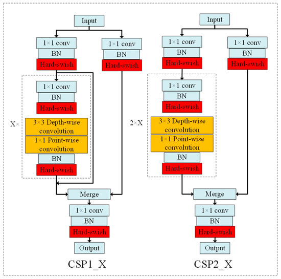 The basic module of the improved foreign object detection model is shown in Figure 11. Replacing the ordinary convolution at the end of the merge channel in the CSP1_ X and CSP2_X module with depthwise separatable convolution reduces the number of parameters in the convolution process and accelerates the inference speed of the model.