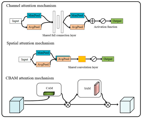 CBAM [31] is a convolutional neural network module based on an attention mechanism, which is used to improve the overall performance of the model. Its essence is to inhibit the expression of redundant features by increasing the weight of non-redundant features. It is composed of a channel attention module (CAM) and a spatial attention module (SAM), and the specific network structure is shown in Figure 13.