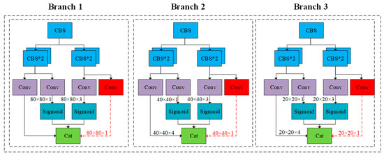 The detection boxes of the YOLO series object detection algorithms are all horizontal boxes, which is not conducive to the detection of foreign objects with diverse distribution directions such as ironware. Therefore, angle regression prediction was added to the head network of YOLOX, and a branch decoupling head based on the angle regression was constructed to accurately locate directional foreign objects. The structure of the rotary decoupling head is shown in Figure 15, where CBS*2 is an acronym for having two CBS modules. The overall network structure of MO-YOLOX is shown in Figure 16.