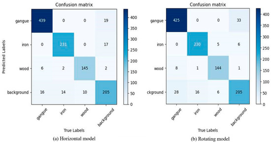 From the experimental results, it can be seen that the performance of the proposed foreign object detection model of the belt conveyor is superior to similar mainstream algorithms on both horizontal foreign object datasets and rotating foreign object datasets. Specifically, when the target foreign object and the coal mine stone have obvious differences in shape and texture, such as large gangue, the proposed horizontal frame foreign object detection model has very excellent performance. However, for slender ironware, the detection effect of the proposed model is slightly poor. It is exciting that the proposed rotating frame foreign body detection model has good detection sensitivity for targets with large length and width, such as slender iron bars, and the cost of angle prediction is a 5.7 ms increase in the reasoning time. There is an obvious difference in length and width between iron and wood, and the proposed model can effectively predict the angle of a foreign body. However, with the irregular gangue, its characteristics are quite different, and the angle information of the data label is irregular, which causes great difficulties in the angle regression prediction of the network. In addition, in the case of slight occlusion from the coal background, both horizontal frame foreign body detection and rotating foreign body detection can accurately detect foreign bodies and determine the types of foreign bodies. Therefore, the experimental results show that the proposed model meets the design requirements.