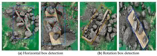 It can be seen from Figure 20 and Figure 21 that the proposed foreign object detection model can effectively detect foreign objects in the case of background coal flow. The rectangle in the figures is the target result predicted by the foreign object detection model, and different colors represent different categories. In Figure 21, the predicted angle information is represented by the long side of the rotating rectangular box, with angle values of 36.8, −30.3, and 65.1, which can verify the effectiveness of the rotation decoupling head in angle regression prediction. Figure 22 and Figure 23 show the results of foreign object detection under coal-flow occlusion and the multi-angle detection results of the same foreign object, respectively. The proposed model can locate the foreign object in the image more accurately, and the performance indicators of the foreign object detection model are shown in Table 5 and Table 6.