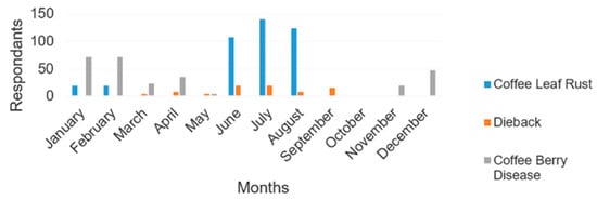 According to our respondents, coffee leaf rust, known as “coffee leaf rust”, is the most dangerous disease ravaging coffee in Rwanda. As shown in Figure 1, the disease occurs mostly in June, July, and August.