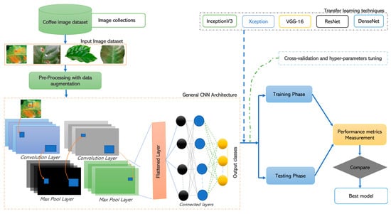 In the following section, this study details all the different models and tools used. The modeling of the coffee leaf images was conducted using different deep-learning techniques, such as InceptionV3, Resnet50, VGG16, Xception, and DenseNet as shown in Figure 2.