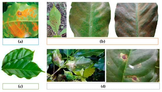 Few sampled coffee leaf image datasets. (a) Rust infection; (b) Red spider mites’ infection in different stages; (c) Health leaf; (d) Miner infections.