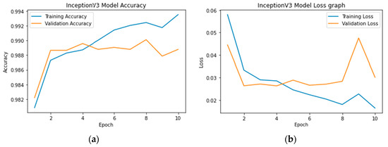 The coffee leaves dataset was divided into training, testing, and validation samples. For training the Inception V3, VGG16, ResNet50, Xception, and DenseNet models, 80% of the coffee leaf samples were utilized. Each model underwent ten epochs, and it was observed that all models started to converge with high accuracy after four epochs. The recognition accuracy of the InceptionV3 model is illustrated in Figure 5a, reaching a training accuracy of 99.34%. Figure 5b depicts the log loss of the InceptionV3 model.