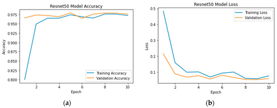 The ResNet-50 architecture consists of 50 layers, including convolutional layers, pooling layers, fully connected layers, and shortcut connections. It follows a modular structure, where residual blocks with varying numbers of convolutional layers are stacked together [62]. Each residual block includes a set of convolutional layers, followed by batch normalization and activation functions, with the addition of the original input to the block. This ensures that the gradient flows through the skip connections and facilitates the learning of residual mappings.