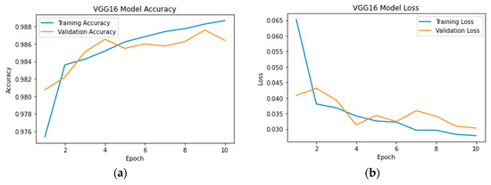 The VGG16 architecture consists of 16 layers, including 13 convolutional layers and 3 fully connected layers. It follows a sequential structure, where convolutional layers are stacked together with max pooling layers to progressively extract features from input images. The convolutional layers use small 3 × 3 filters, which help capture local patterns and details in the images [66]. The architecture maintains a consistent configuration throughout the network, with the number of filters increasing as the spatial dimensions decrease. This uniformity simplifies the implementation and enables the straightforward transfer of learned weights to different tasks [67].