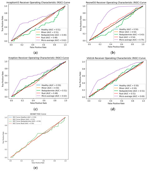 The performances of models, such as Inception V3, Xception, VGG-16, ResNet-50, and DenseNet, are evaluated with different metrics to identify the most suitable model for the accurate classification of coffee plant leaf diseases. The evaluation metrics, such as ROC, and precision–recall values, were measured.