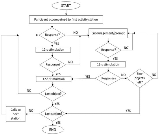 The intervention phase, which was preceded by four to six practice sessions, involved the use of the technology system that worked as described in Section 2.4. During the practice sessions, the participants (a) familiarized with the technology system (i.e., with its stimulation deliveries for the responses, calls to a new station, and encouragements/prompts), and (b) could receive research assistants’ verbal or verbal and physical prompts in combination with the system encouragements/prompts. During the regular intervention sessions, which followed the practice sessions, research assistants’ prompts were no longer available. At the start of each session, the research assistants accompanied the participants to the first activity station and told the participants that they could put the objects in the container. The system provided 12 s of preferred stimulation after each response detected (see Figure 1). In case of no responding (i.e., after an interval of 22 s had elapsed from the previous response), the system delivered a verbal encouragement/prompt to put an object in the container (see Figure 1). The encouragement/prompt was automatically repeated at 10 s intervals until a response was detected.