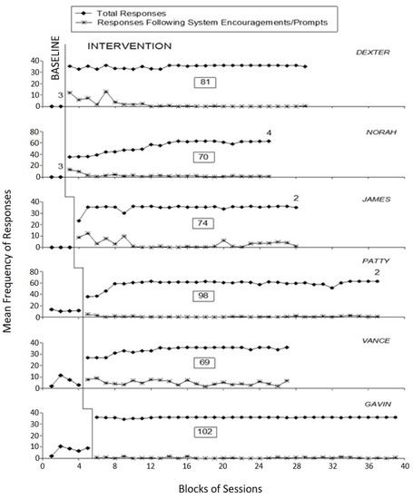 Fourth, while the use of the system brought about a positive change with all participants, two of the differences characterizing the participants’ performance may be noteworthy. One such difference concerned the response frequency/speed. Some participants (i.e., Norah and Patty) performed a larger number of responses than all other participants in sessions whose length was generally shorter than that of the other participants. The other difference was the participants’ use of system encouragements/prompts. Four of them (i.e., Dexter, Norah, Patty, and Gavin) used the encouragements/prompts at (very) low rates with possible exceptions for the beginning of the intervention phase. The other two participants (i.e., James and Vance) seemed to have a somewhat larger use of the encouragements/prompts.