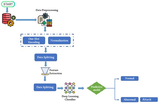 40]. A deep learning system is suggested in this paper to distinguish between regular and abnormal network actions. Data processing, feature extraction, and classification were the primary components presented in the suggested framework.
