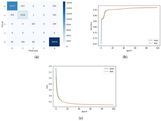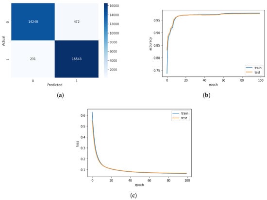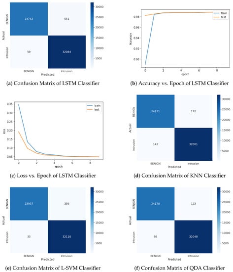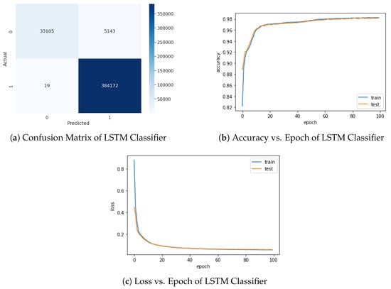Figure 6a–c. Experimental results demonstrated that the LSTM classifier attained the most acceptable performance for binary classification (99.2%).